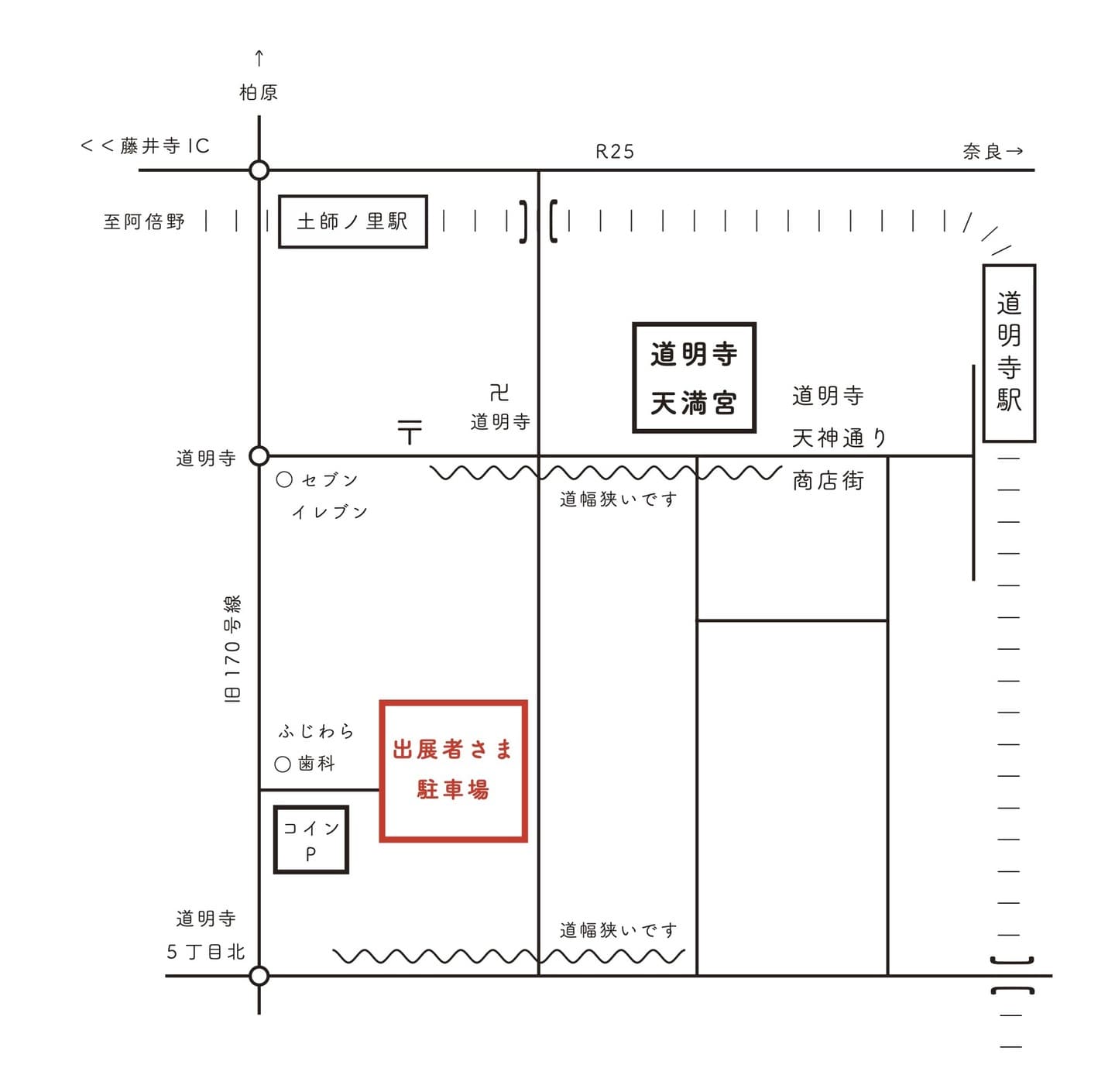 〈車でお越しの方へ〉 | ①道明寺天満宮 境内駐車場に駐車し、搬入前に受付を行なってください。 ②駐車場から手持ちでブースへ荷物を搬入ください。 ※ブースへの車の進入は、事前申請の方のみ。台数制限あり ③搬入後は、速やかに「出展者さま用駐車場」へお車を移動してください。 |